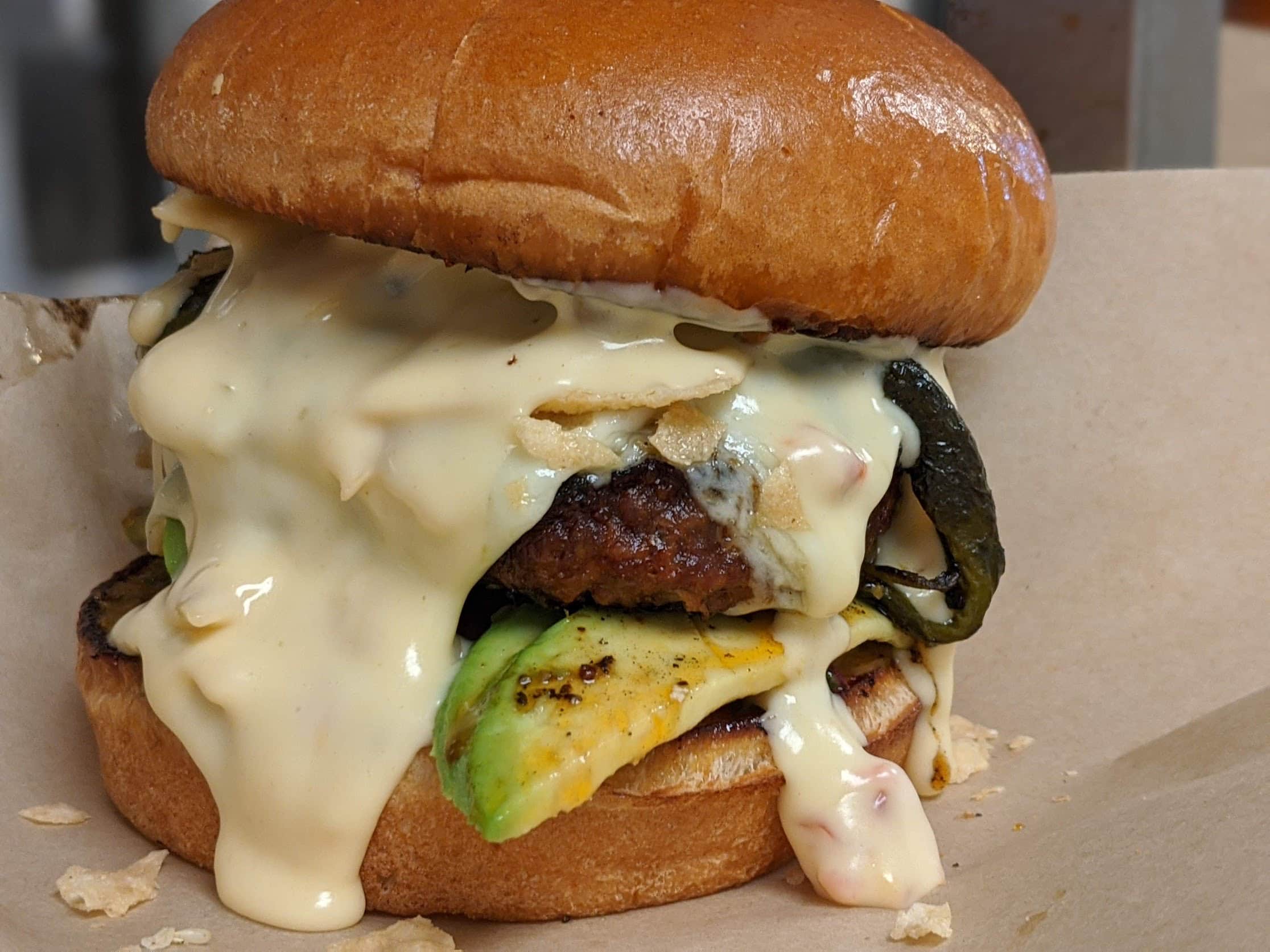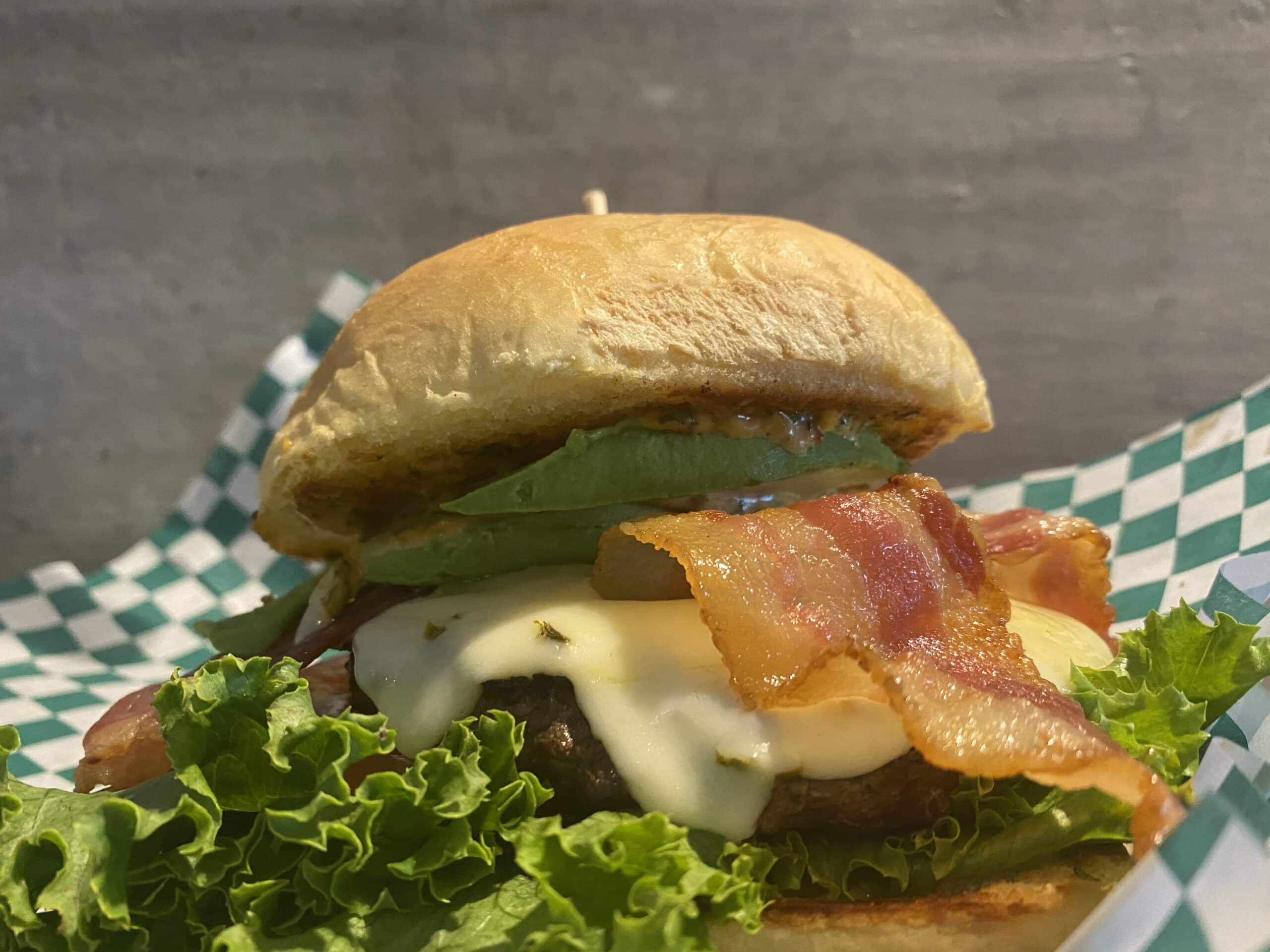 Pepper jack, lettuce, tomato,red onion, avocado, chipotle mayo on a pub bun.