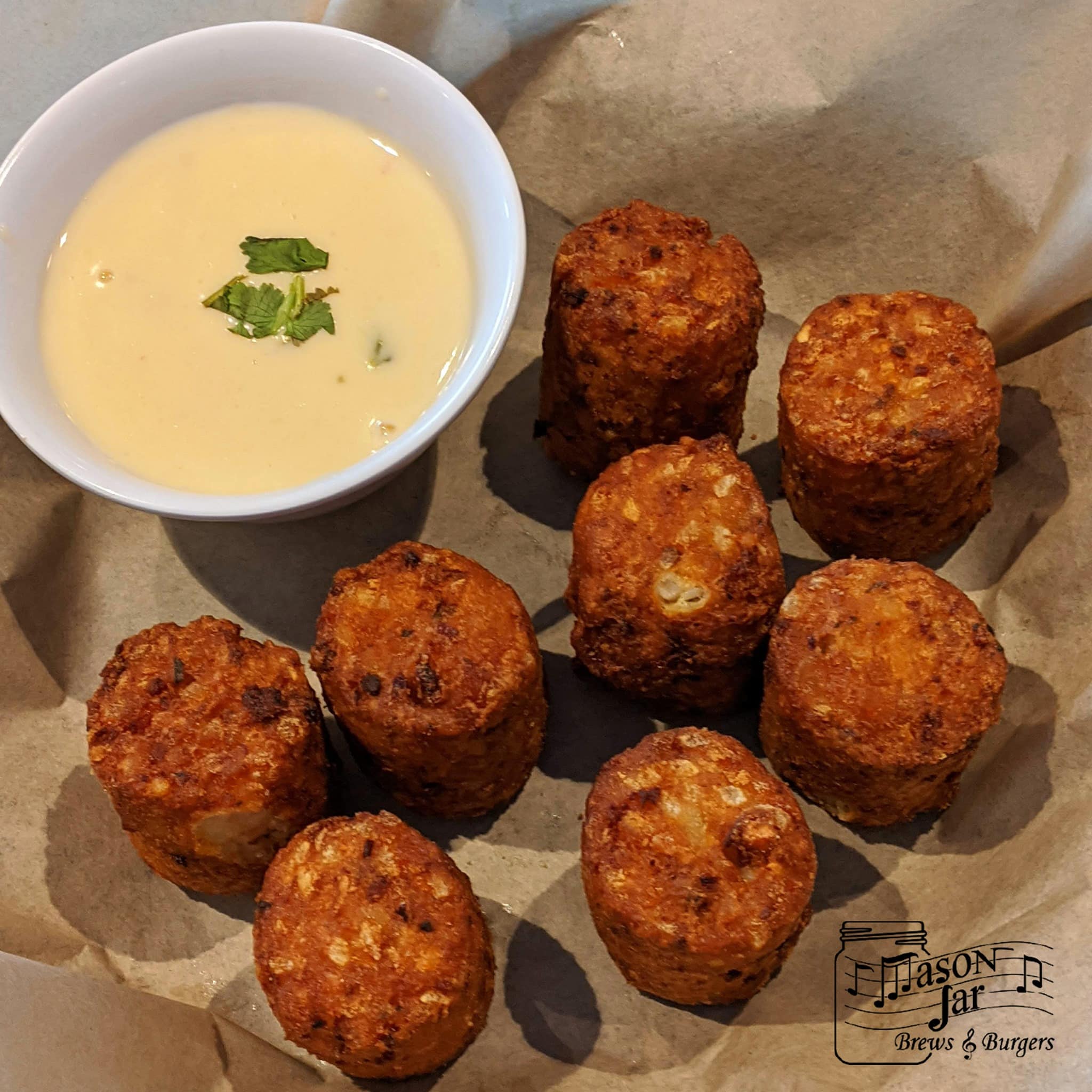 Eight giant tater tots filled with cheese and bacon served with queso.