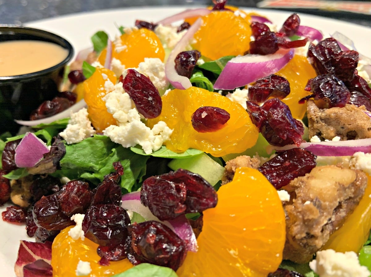 50/50 blended mix, feta cheese, mandarin oranges, dried cranberries, red onion, avocado, cucumbers, candied walnuts – apple vinaigrette.
