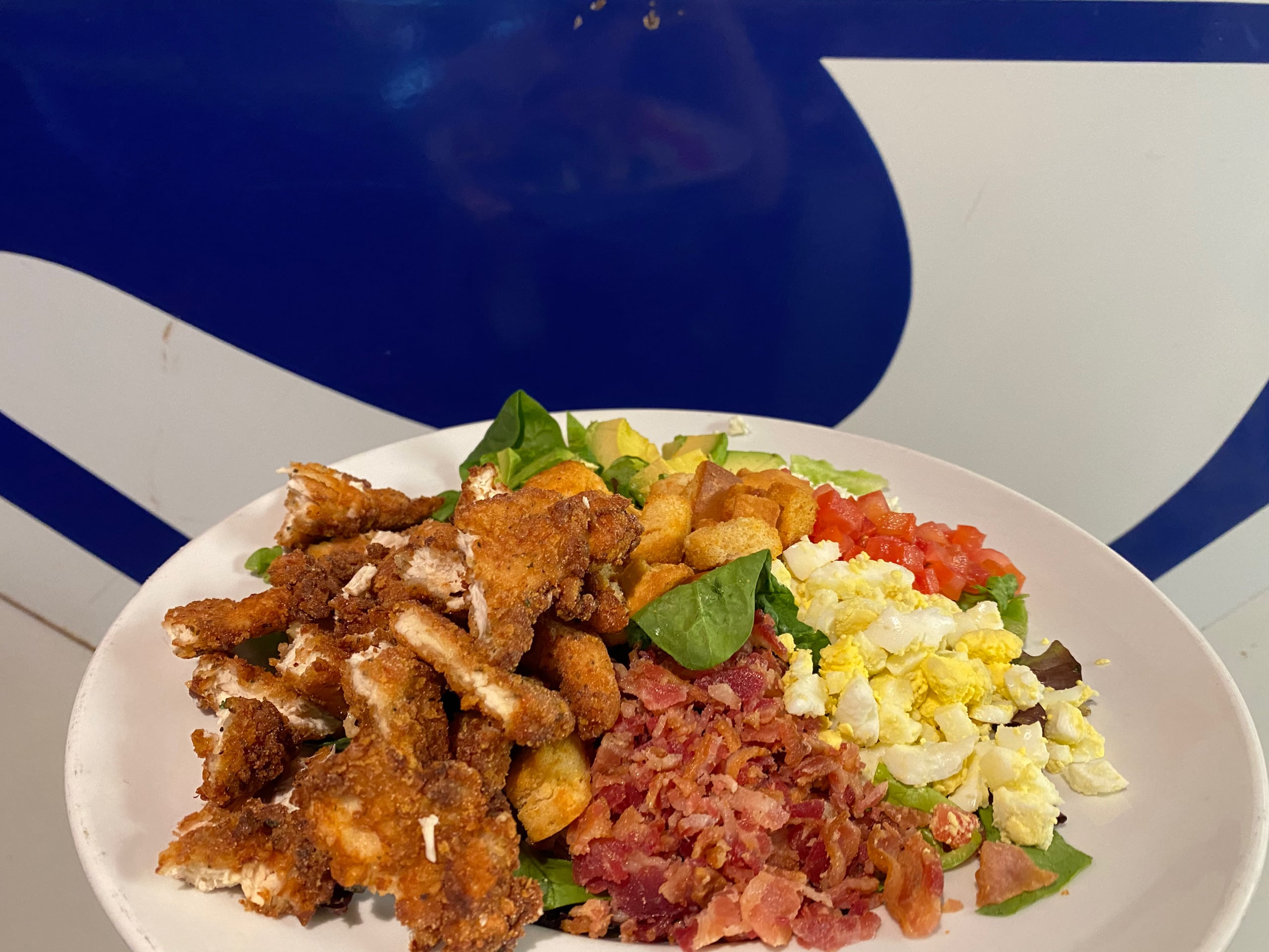 50/50 blended mix, bleu cheese, bacon, egg, diced tomatoes, avocado, garlic croutons, fried chicken tenders – honey mustard.