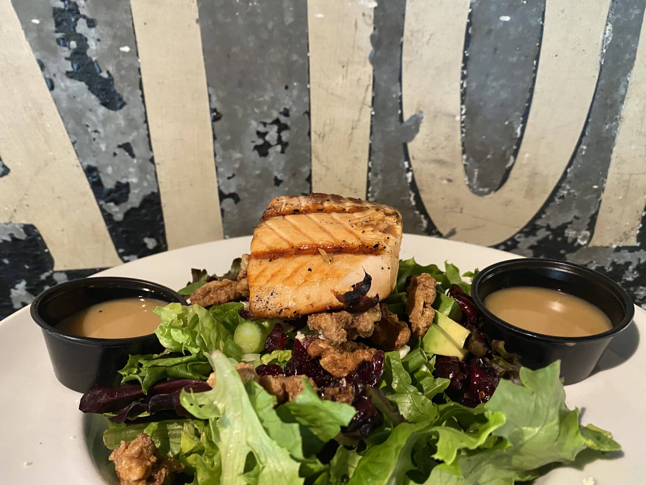 50/50 blended mix, bleu cheese, craisins, candied walnuts, green onion, avocado, topped with salmon- apple vinaigrette.