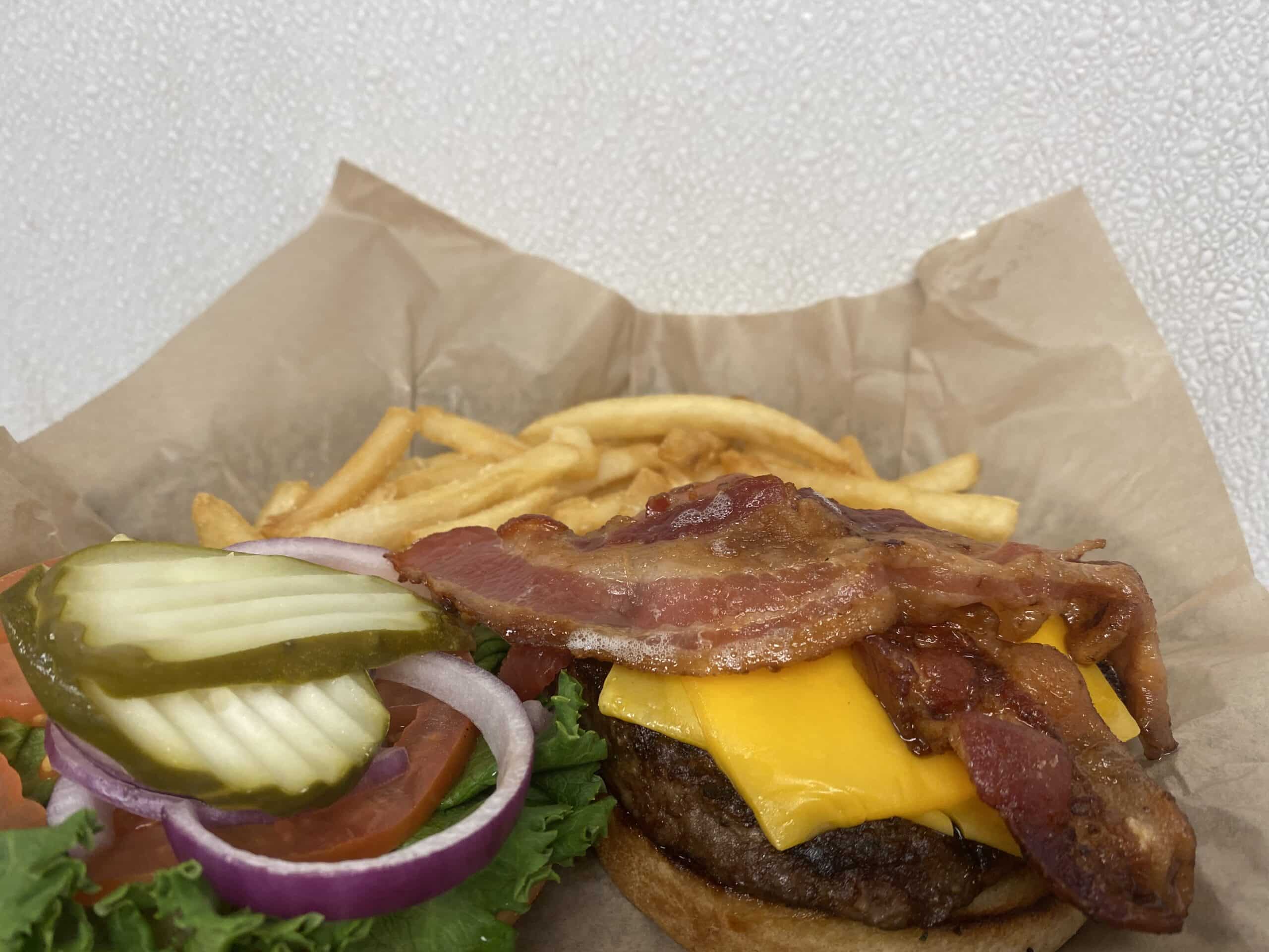 Cheddar, lettuce, tomato, caramelized onions, pickle, Russian dressing on a pub bun.